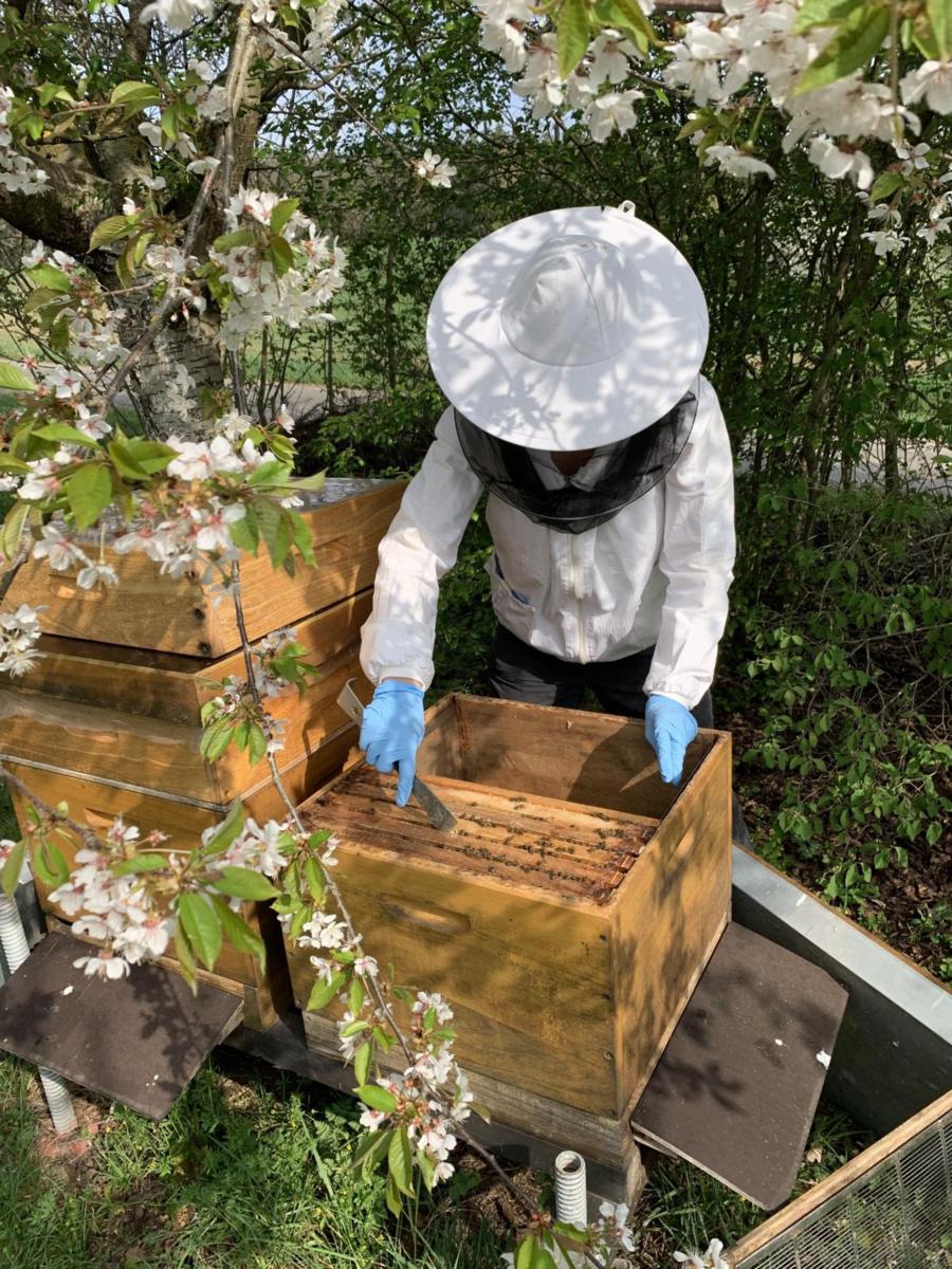 Die Tage sind wärmer geworden, und die Bienen sammeln fleißig Nektar und Pollen für ihren Nachwuchs. Mit Beginn der Kirschblüte, haben wir ihr Haus, die sogenannte Beute, um ein Stockwerk erhöht, damit sie Platz haben, um Honig einzulagern. Eine Woche später haben wie sie wieder besucht.