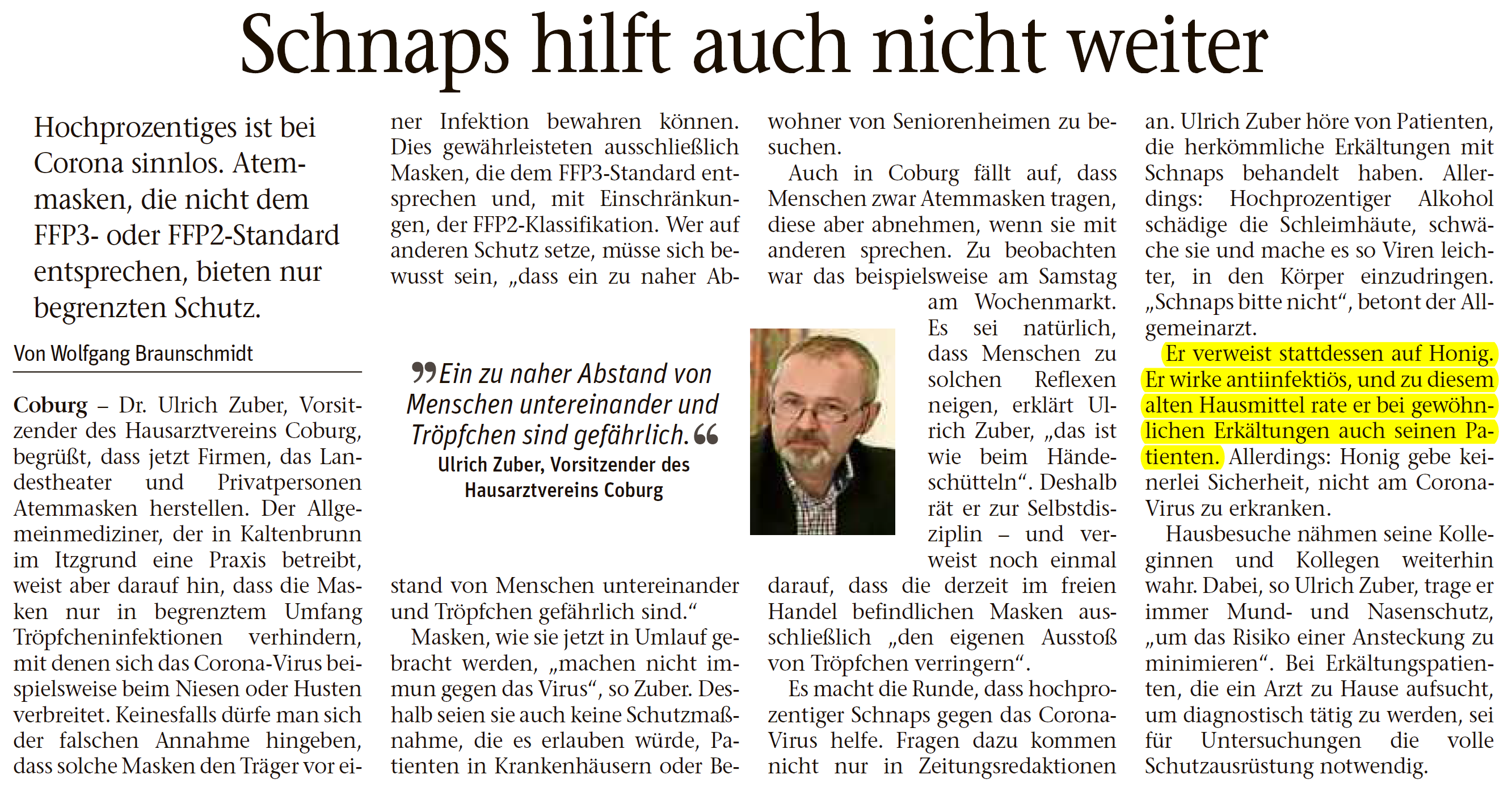 Am 24.3.2020 erschien in der Neuen Presse Coburg ein Artkel, in dem auf die antiinfektiöse Wirkung von Honig hingewiesen wird. Wir dürfen ihn mit freundlicher Genehmigung der NP verwenden. |